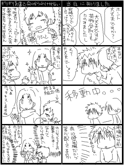 コピー本準備できてなくて、いっぱい謝りました……(´;ω;`)わざわざいらしてくれてるのに……準備出来てないなんて!!気持ち的には切腹したかったです。゚ヽ(゚`Д´゚)ノ゚。